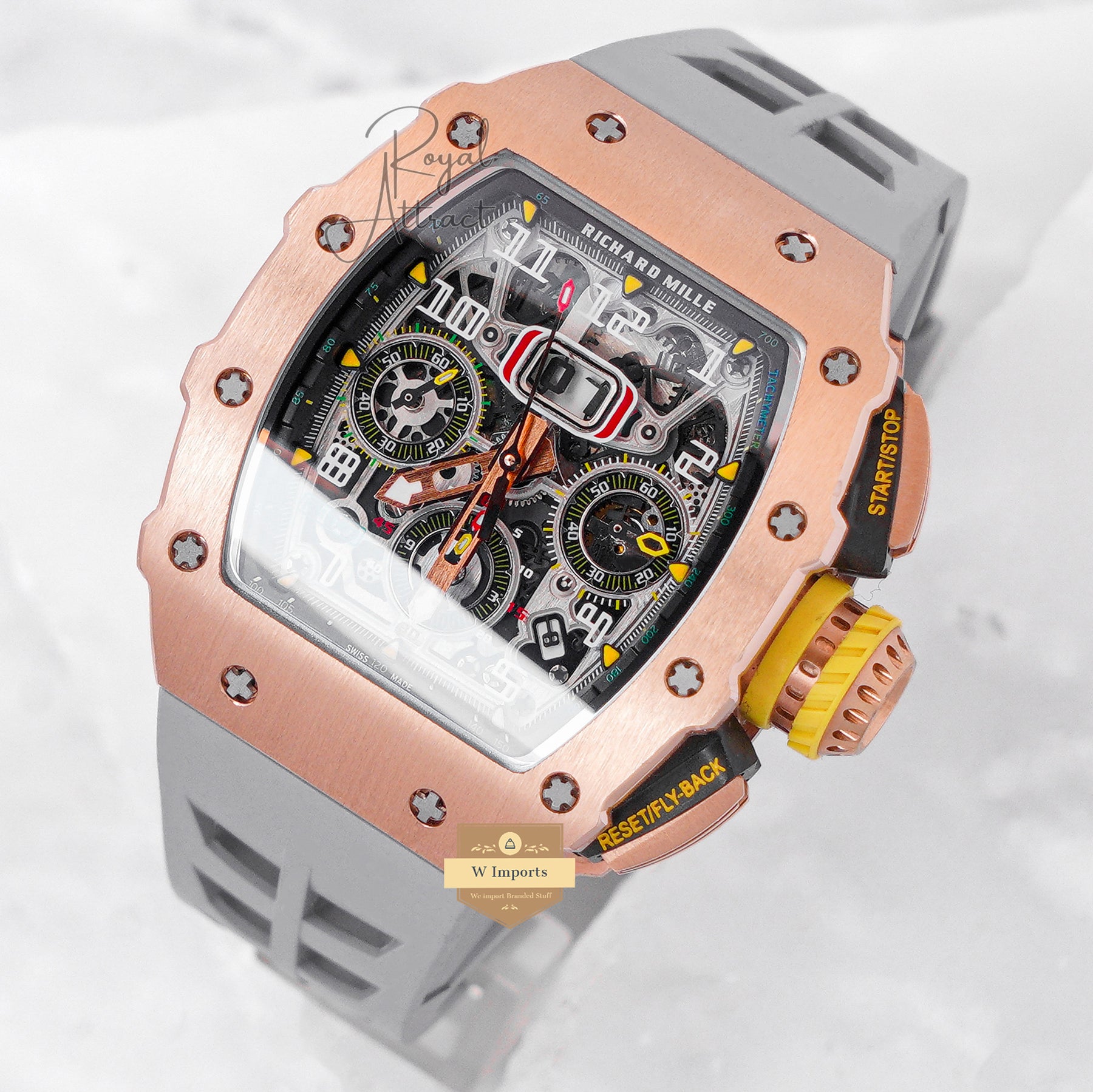 Latest Collection Chronograph Rose Gold Case Skeleton Dial With Gray Rubber Strap