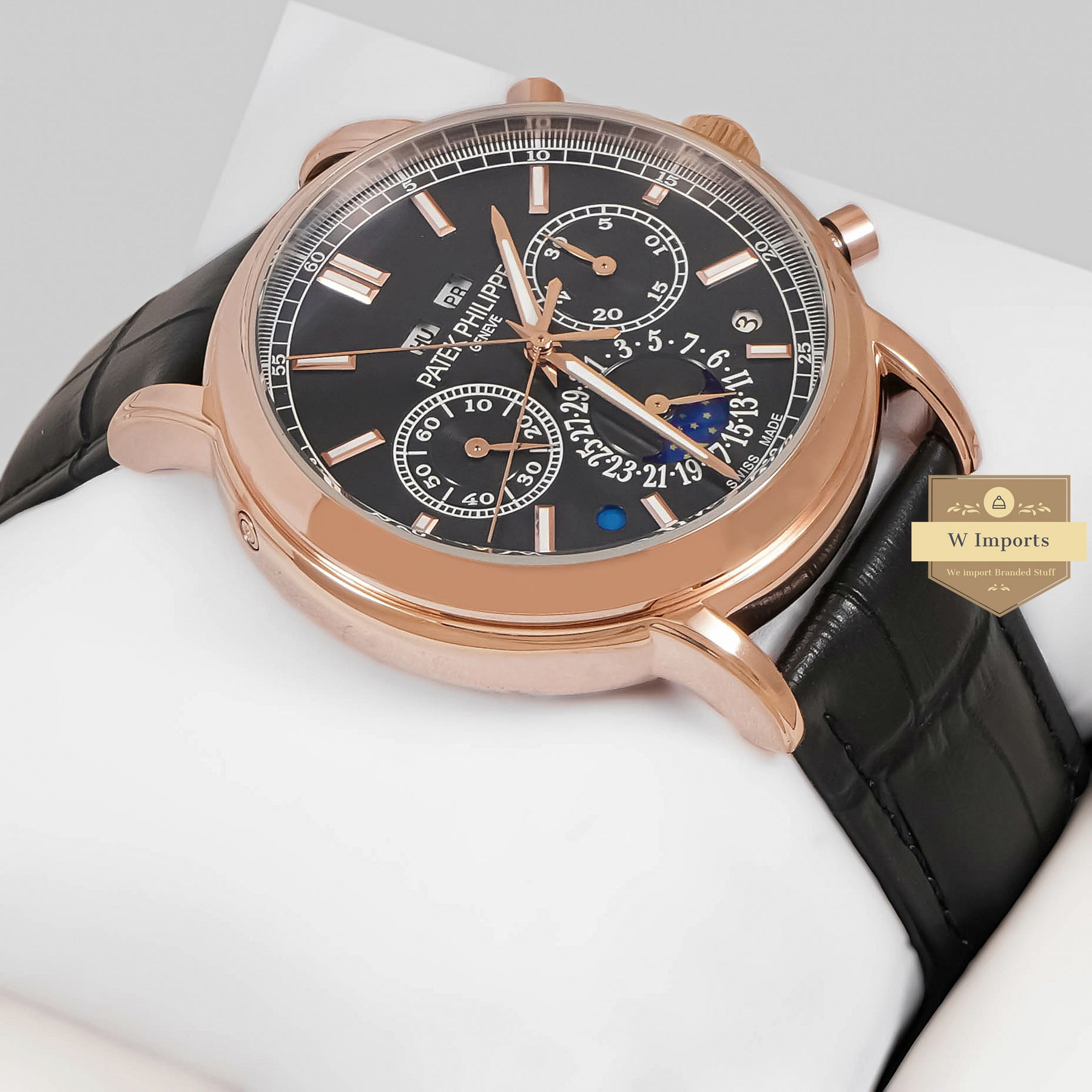 Latest Collection Annual Calender Moon Phase Rose Gold Case With Blue Dial & Leather Strap